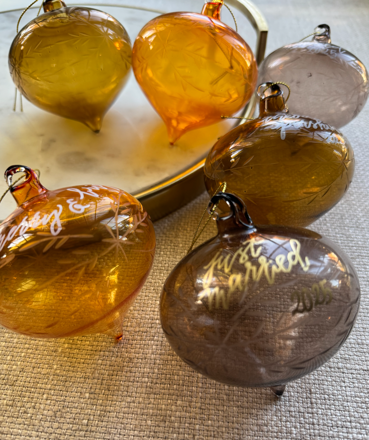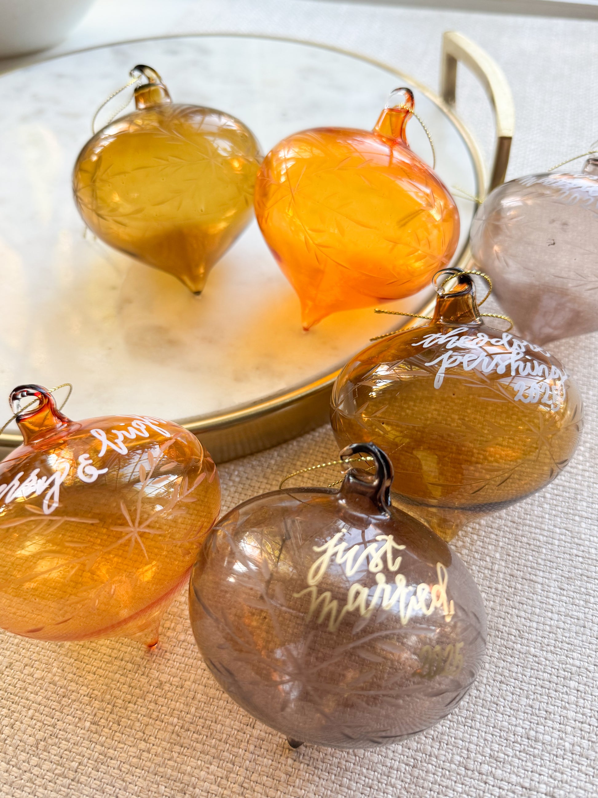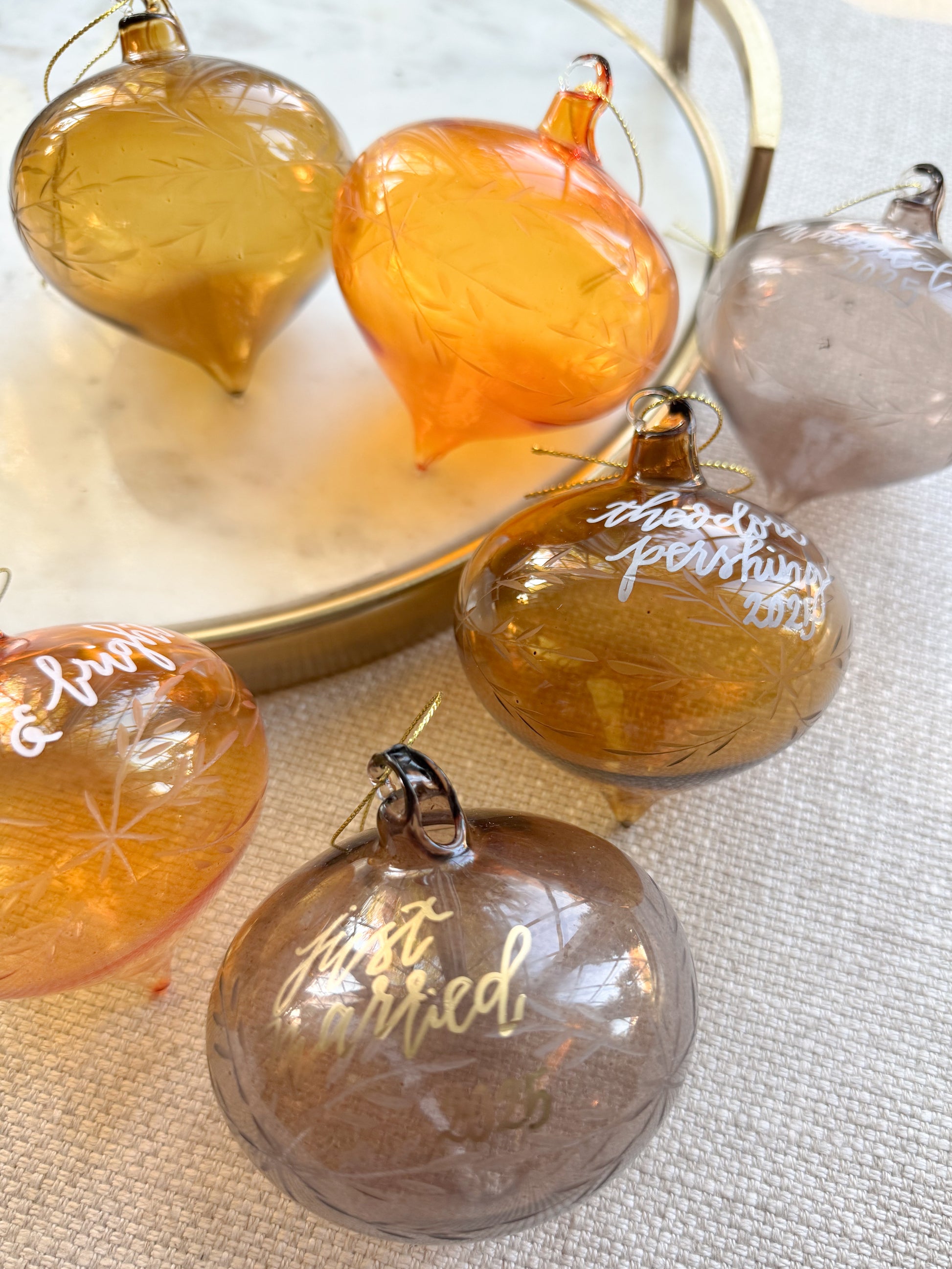 Ornament personalization is custom written by hand in gold paint pen if desired. Colors may vary by device. Each ornament is unique and handwritten, and can commemorate past dates/years, and any occasion. Writing may be larger or smaller depending on the length of the wording provided by the client.