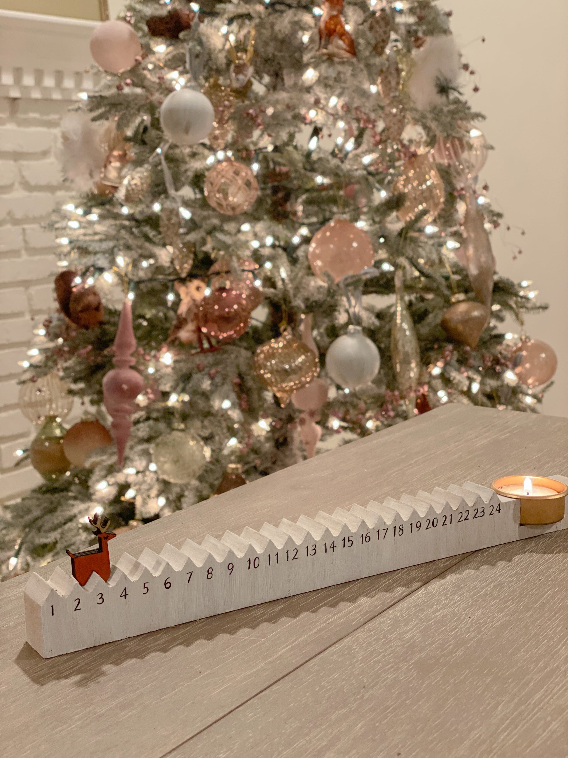 Counting down the days to Christmas with this wooden advent calendar and traveling reindeer. Small votive candle holder on right side.